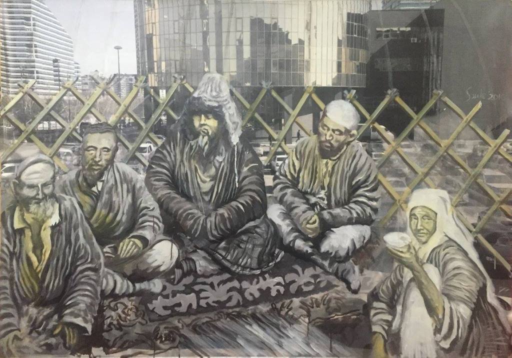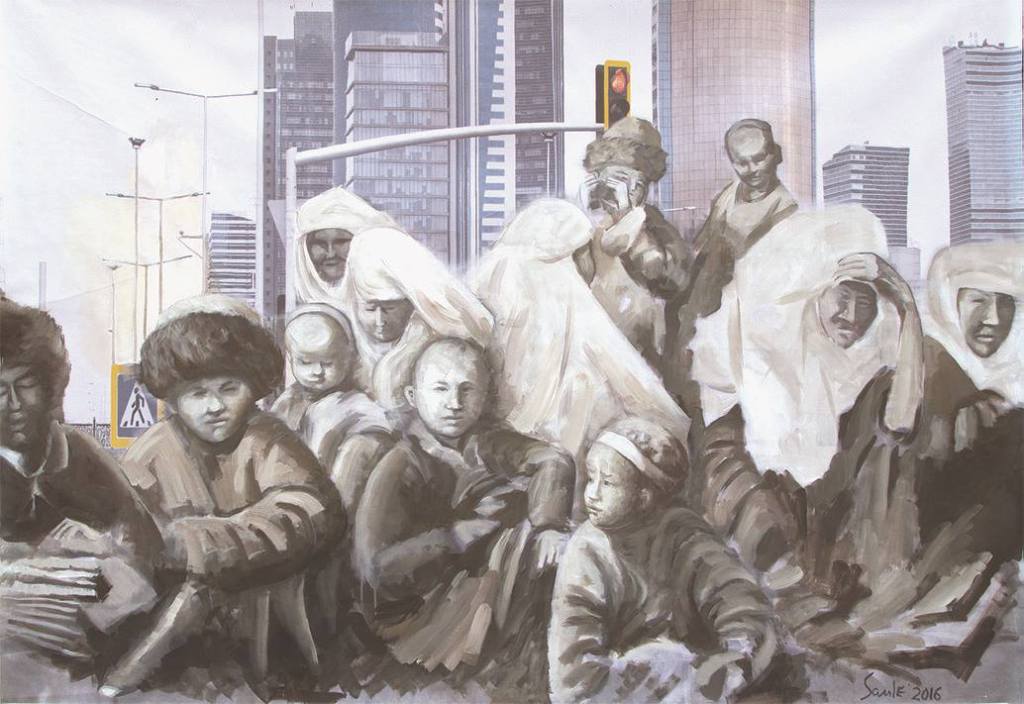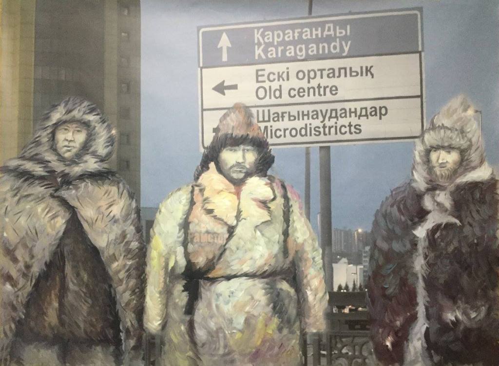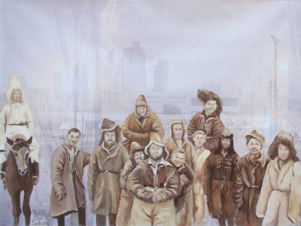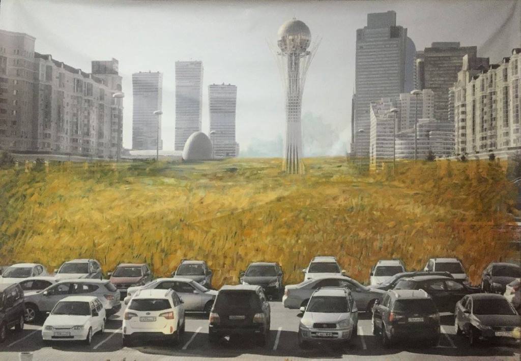 The idea was to paint over with the archetypal images of Kazakhs taken from archival photo sources or the steppe. Those photos were used to be later covered with current views of Astana and those that were made several years ago at the same place where the present skyscrapers are. So again, here one deals with the time, horizontal freedom of the steppe vs. vertical urbanism of contemporary cities, new identity that was partly implemented with the capitalistic state of mind – the bigger the better, luxury glassy structures as oppose to moving nomadic and naturally looking objects. The mixture of past and the present. The mixture of painting and photography. The mixture of steppe and urbanization. The mixture of archetypes and reality where it is confusing what is more artificial.