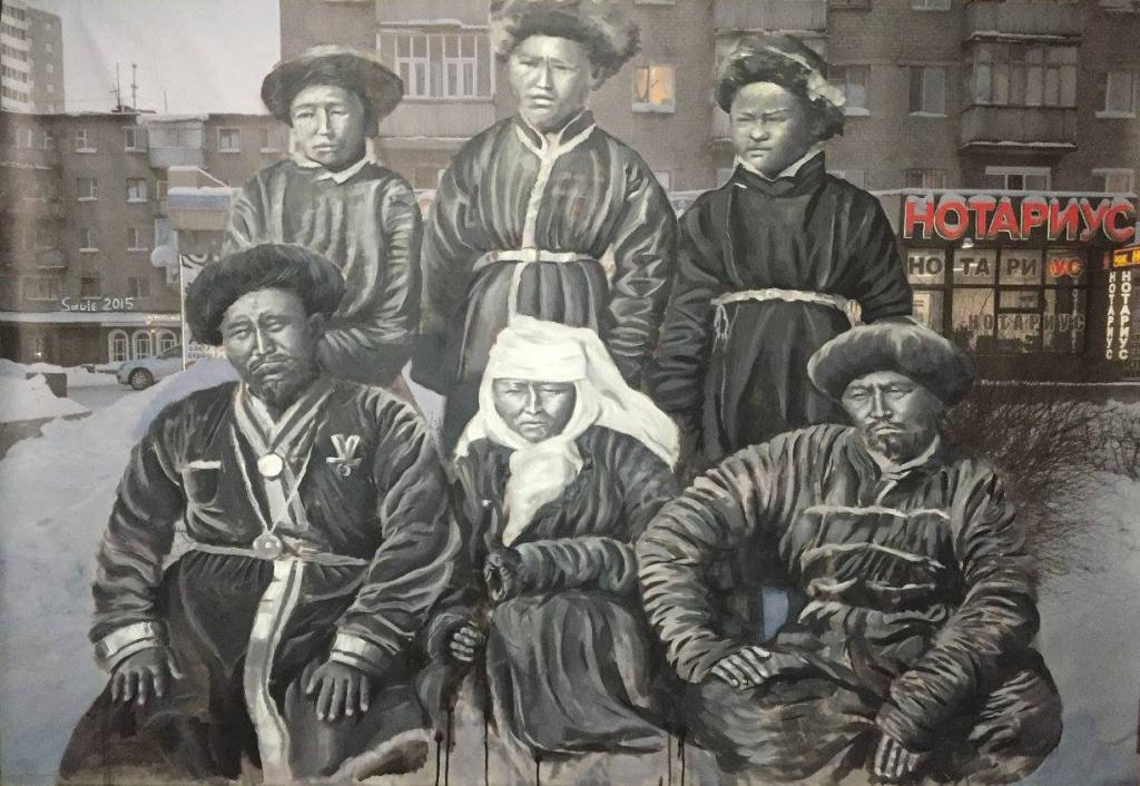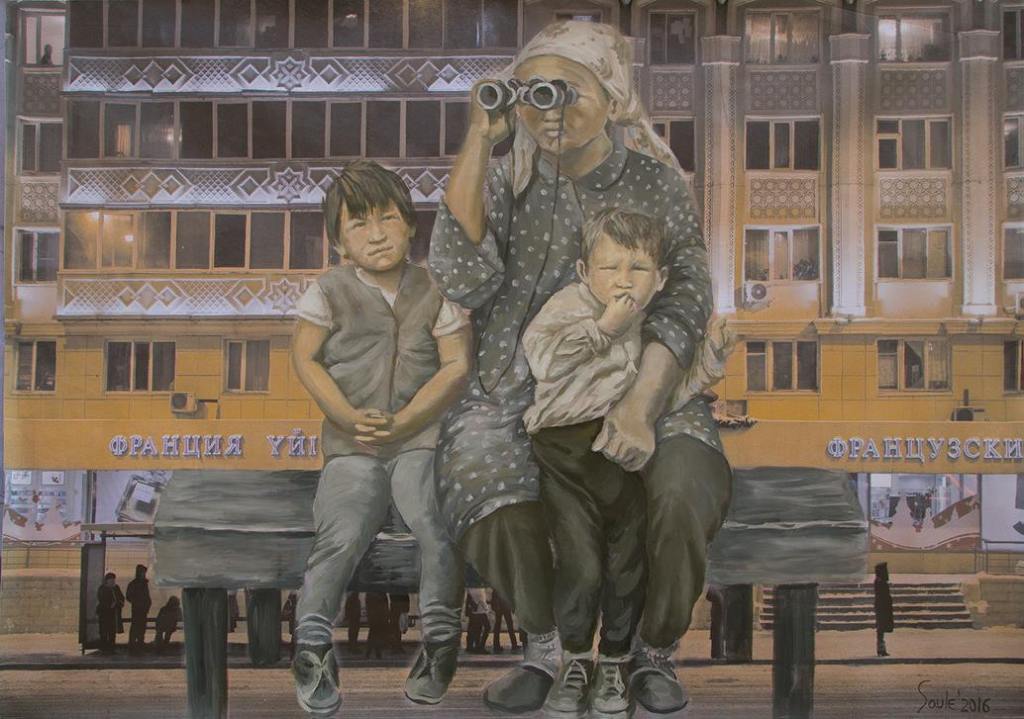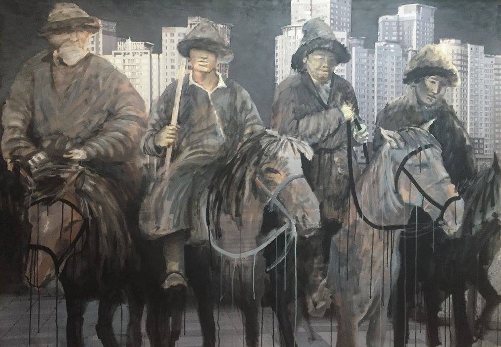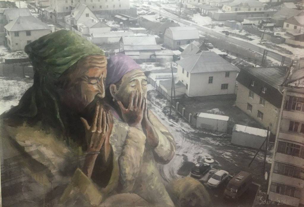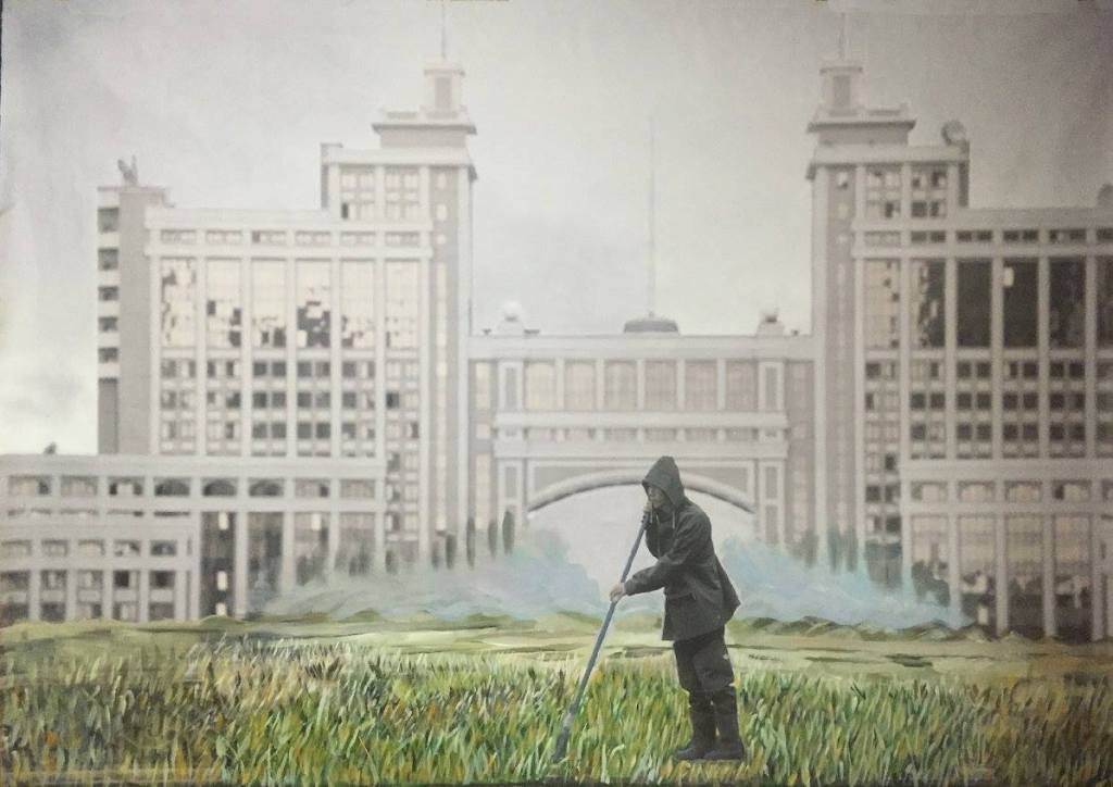 The idea was to paint over with the archetypal images of Kazakhs taken from archival photo sources or the steppe. Those photos were used to be later covered with current views of Astana and those that were made several years ago at the same place where the present skyscrapers are. So again, here one deals with the time, horizontal freedom of the steppe vs. vertical urbanism of contemporary cities, new identity that was partly implemented with the capitalistic state of mind – the bigger the better, luxury glassy structures as oppose to moving nomadic and naturally looking objects. The mixture of past and the present. The mixture of painting and photography. The mixture of steppe and urbanization. The mixture of archetypes and reality where it is confusing what is more artificial.