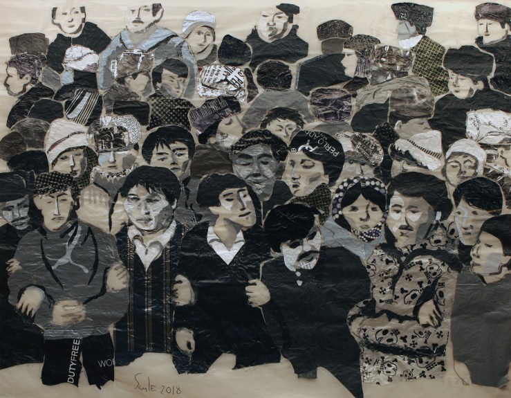Saule Suleimenova (b. 1970) is an artist working in a variety of mediums from paintings and graphics to public art. In 1996 Suleimenova graduated from the Kazakh Leading Academy of Architecture and Civil Engineering with a degree in architectural design. In her work, Suleimenova explores the construct of collective memory, and researches archives and photographs as well as the semiotics of contemporary cities and the history of Qazaqstan. Her most recent series titled Cellophane Painting is made out of used plastic bags and consists of motifs from socio-political (Asharshalyk, Karlag, human rights, Uyghur genocide) to highly personal (family members, flowers, cityscape)