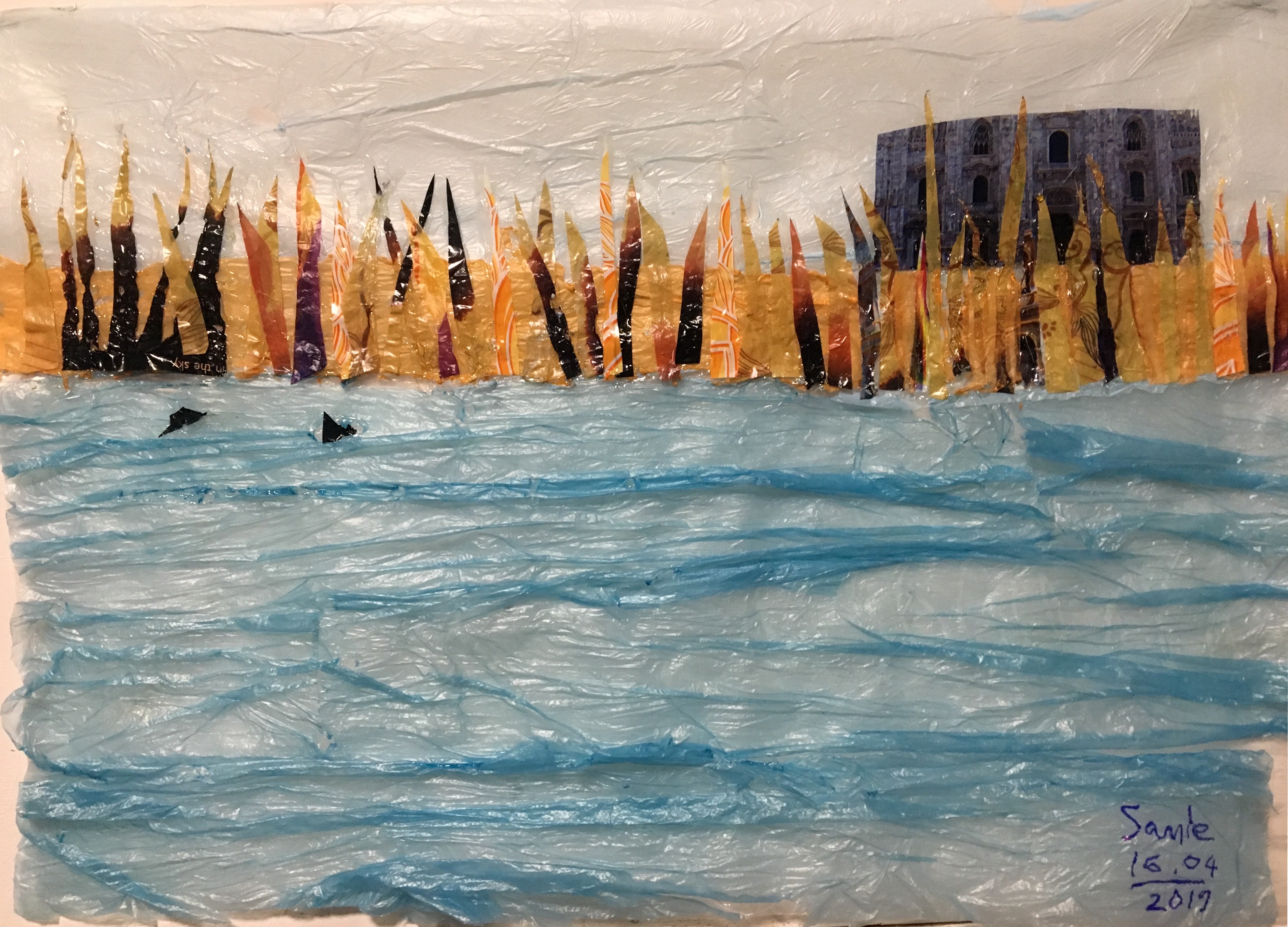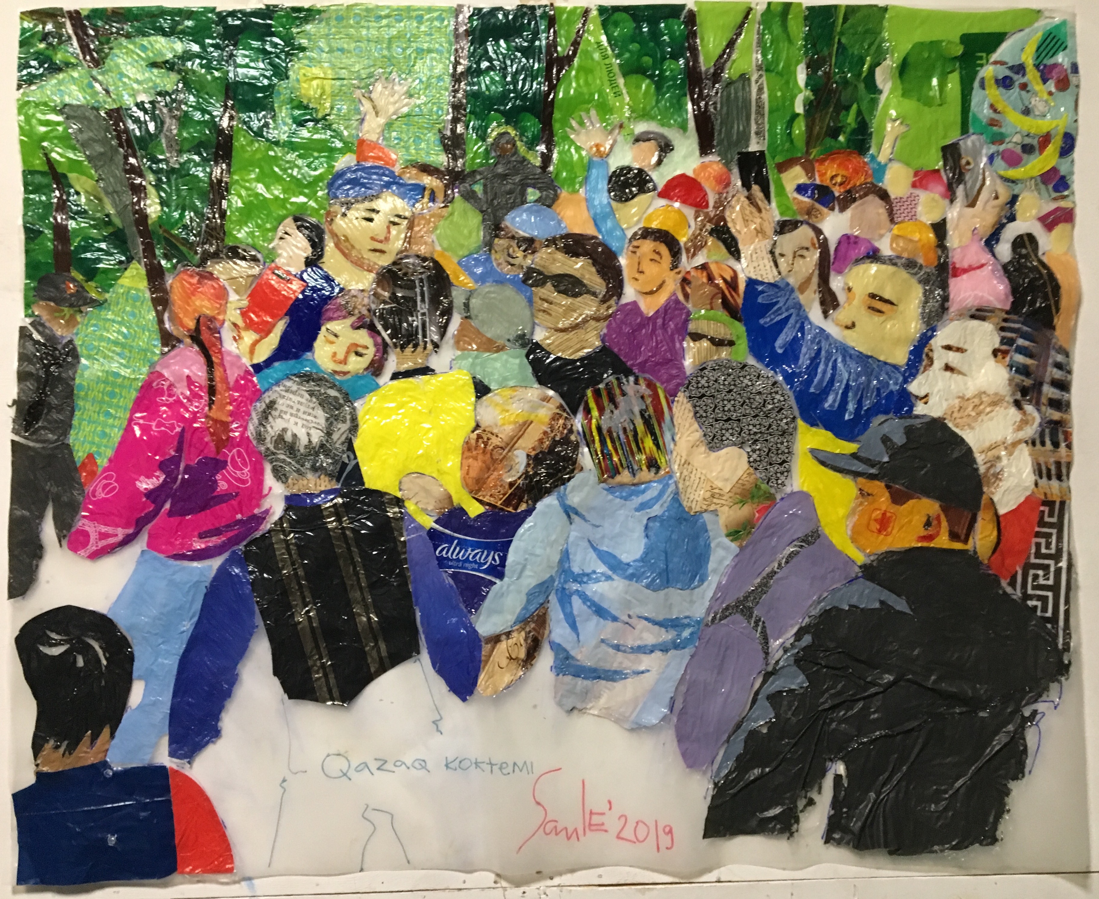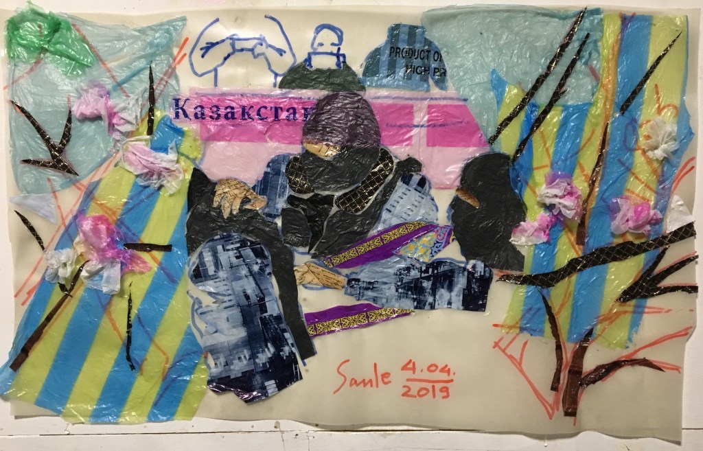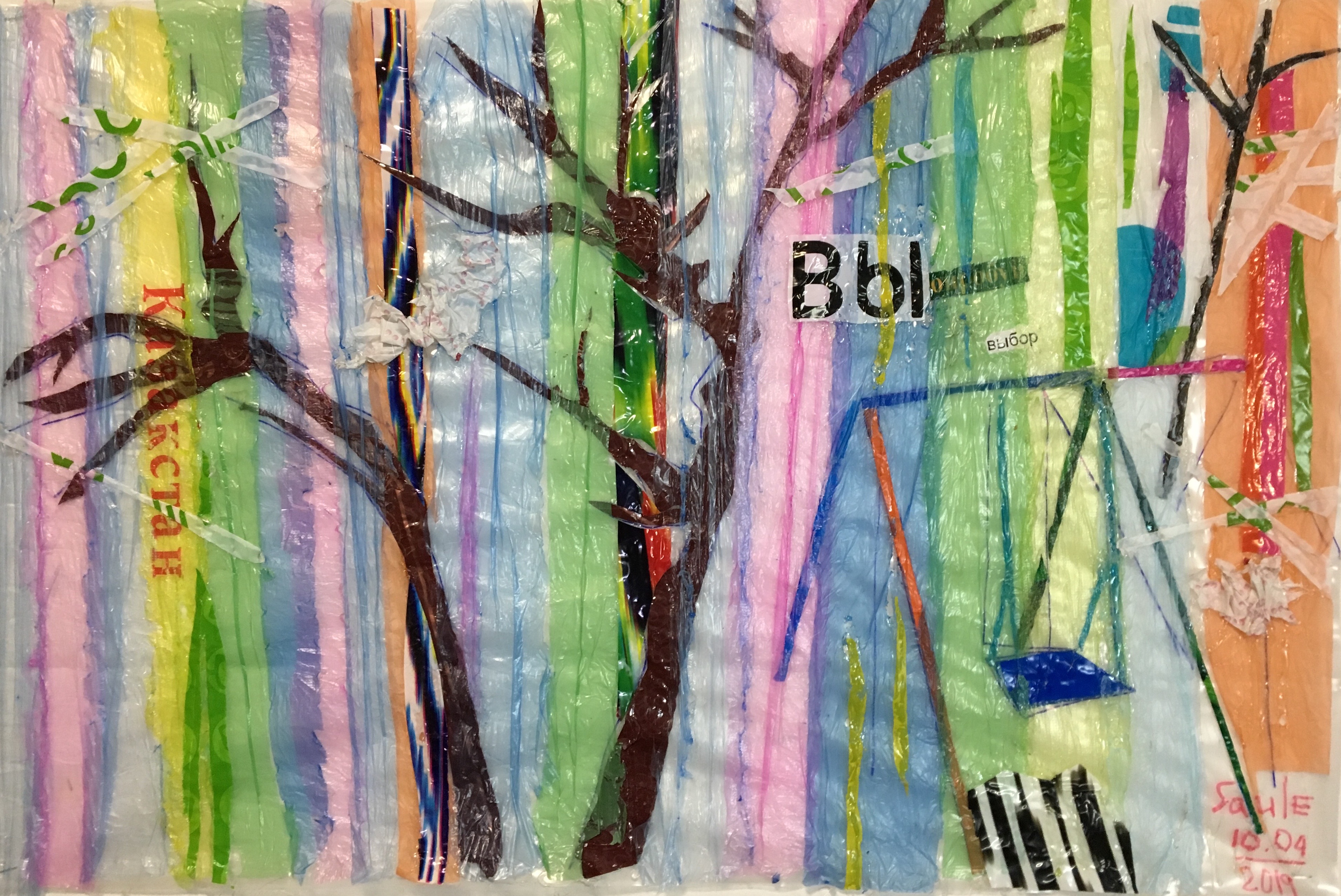 The first day. View from my window. Plastic bags, polyethylene. 70×56 cm. April 1, 2019.April 2, 2019 – the strike of oil workers in Aktau. Plastic bags, polyethylene. 70×56 cm. April 2, 2019.April 3, 2019 Trial of Svetlana Glushkova. Svetlana’s face is a mirror. Plastic bags, polyethylene, mirror. 50×62 cm. April 3, 2019.April 4, 2019 Blooming apricot and security officers. Plastic bags, polyethylene. 50×70 cm.April 5, 2019. The first tulip through the netting netting in a neighboring yard. Plastic bags, polyethylene. 70×54 cm.Diary of changes. April 8, 2019. The construction of the GLK on Kok Zhailau has been postponed. Plastic bags, polyethylene. 70×56 cm. #plasticdiaryofchanges #sauleplastickundelikRain. You are the choice. Plastic bags, polyethylene. 56×70 cm. April 10, 2019.Diary of changes. NPP in Kazakhstan. Russia invited Kazakhstan to build a nuclear power plant near Lake Balkhash. At the same time, everyone has a fresh disaster at the Fukushima nuclear power plant. There is no nuclear power plant in Kazakhstan! Plastic bags, polyethylene. 70×50 cm. April 12, 2019. # netaeskvazakhastane #plasticdiaryofchanges #sauleplastickundelik #city codeDiary of changes. Ulken. Balkhash. The authorities called the village of Ulken in the Almaty region as a likely place for the construction of a nuclear power plant. April 16, 2019. Plastic bags on polyethylene. 43×61 cm #netaesvkazahastane #plasticdiaryofchanges #sauleplastickundelik #notrdamdepari #azattyk #petrotsenko #city codeQazaq Kóktemi. 2019 plastic bags, polyethylene. 75×94 cm #plasticdiaryofchanges #sauleplastickundelik #qazaqkoktemi #qazaqkóktemi #adilsailayushin #menoyandym