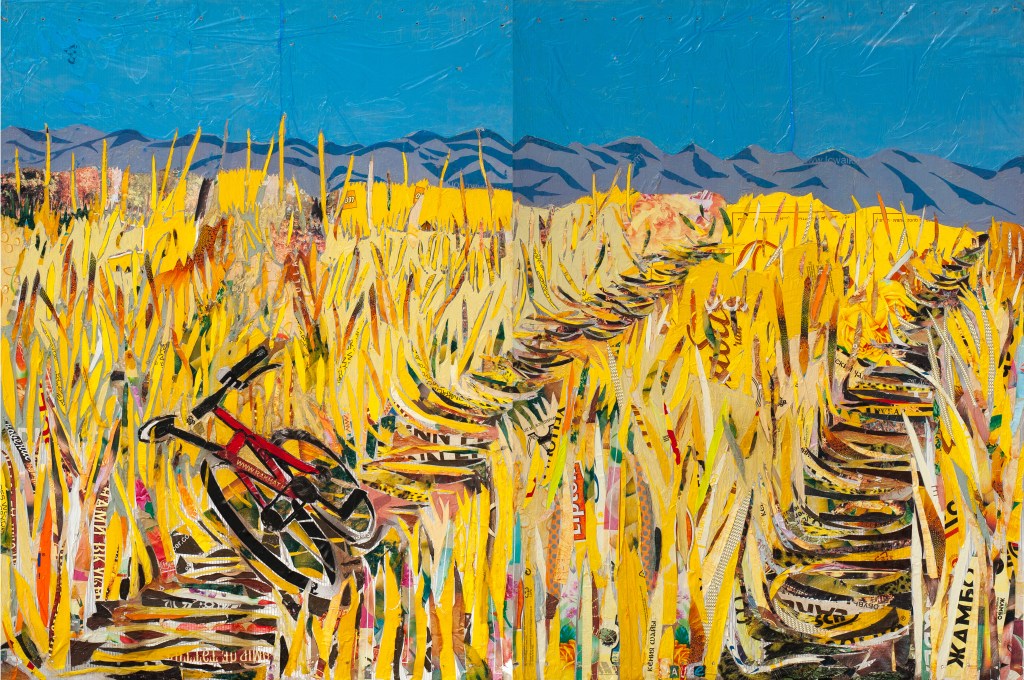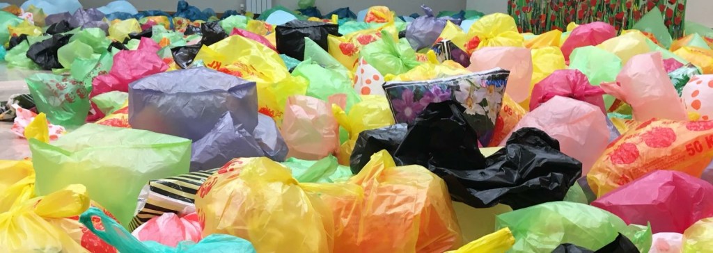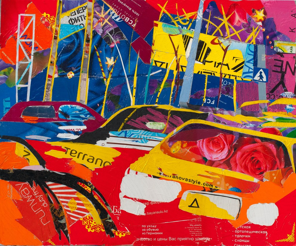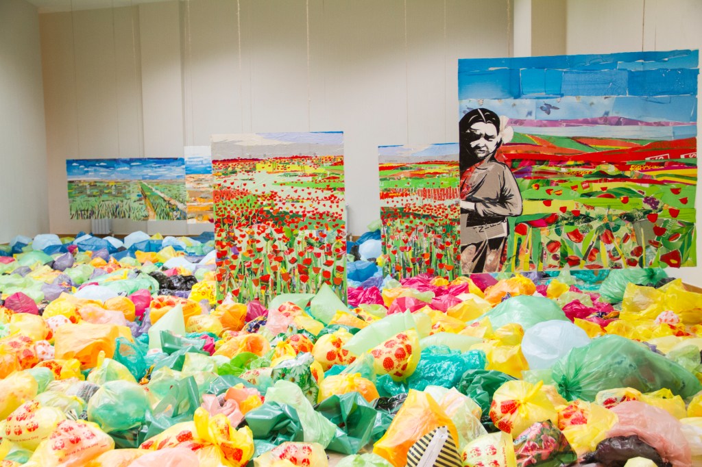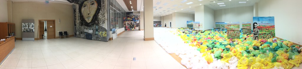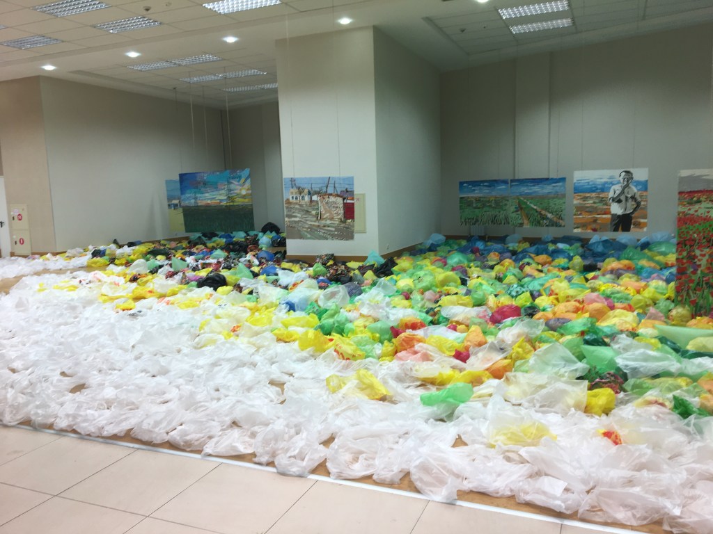 The project includes series of artworks made of plastic bags glued on polycarbonate sheets. The artworks are made with no paints or other traditional materials such as canvas, brush, bronze or anything institutional. Exclusively with plastic bags – some of them are branded with titles from the boutiques, shops, supermarkets, some just garbage bags. All the material was collected by public with assistance of AlaDalaArt (art of colorful steppe) – action that was started in 2016.