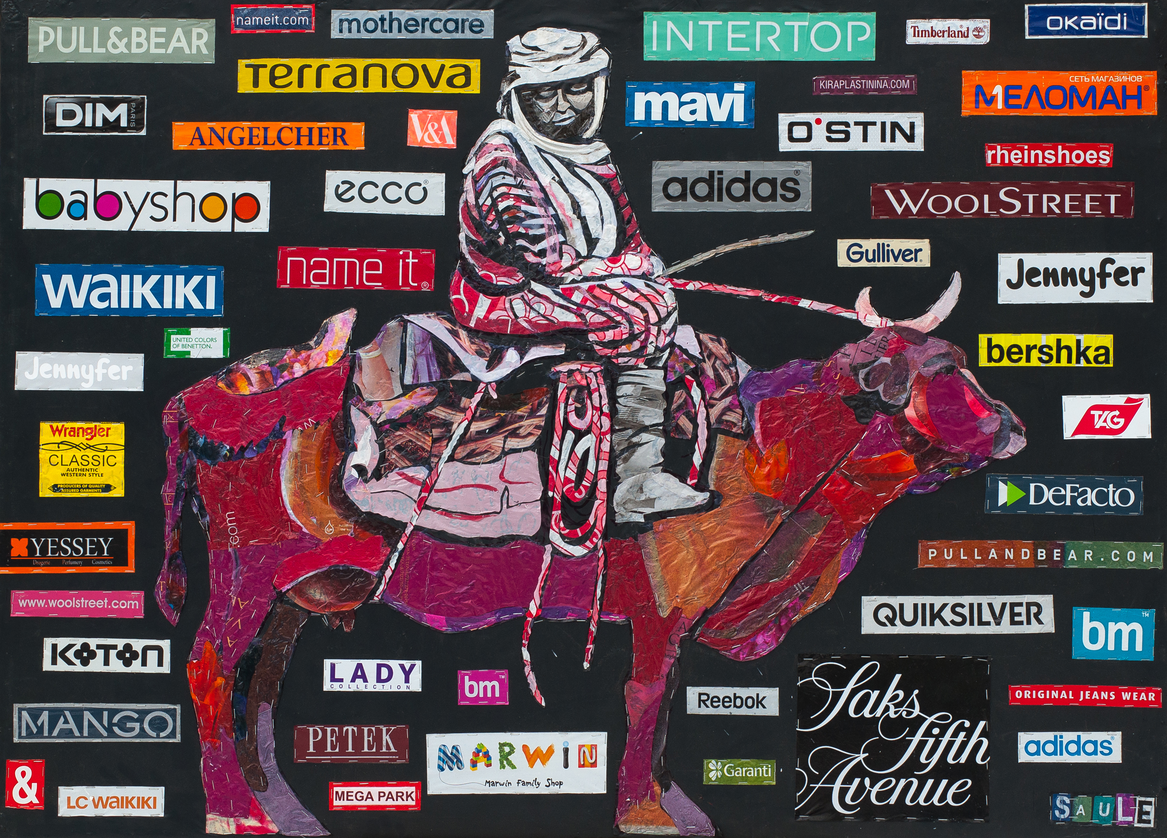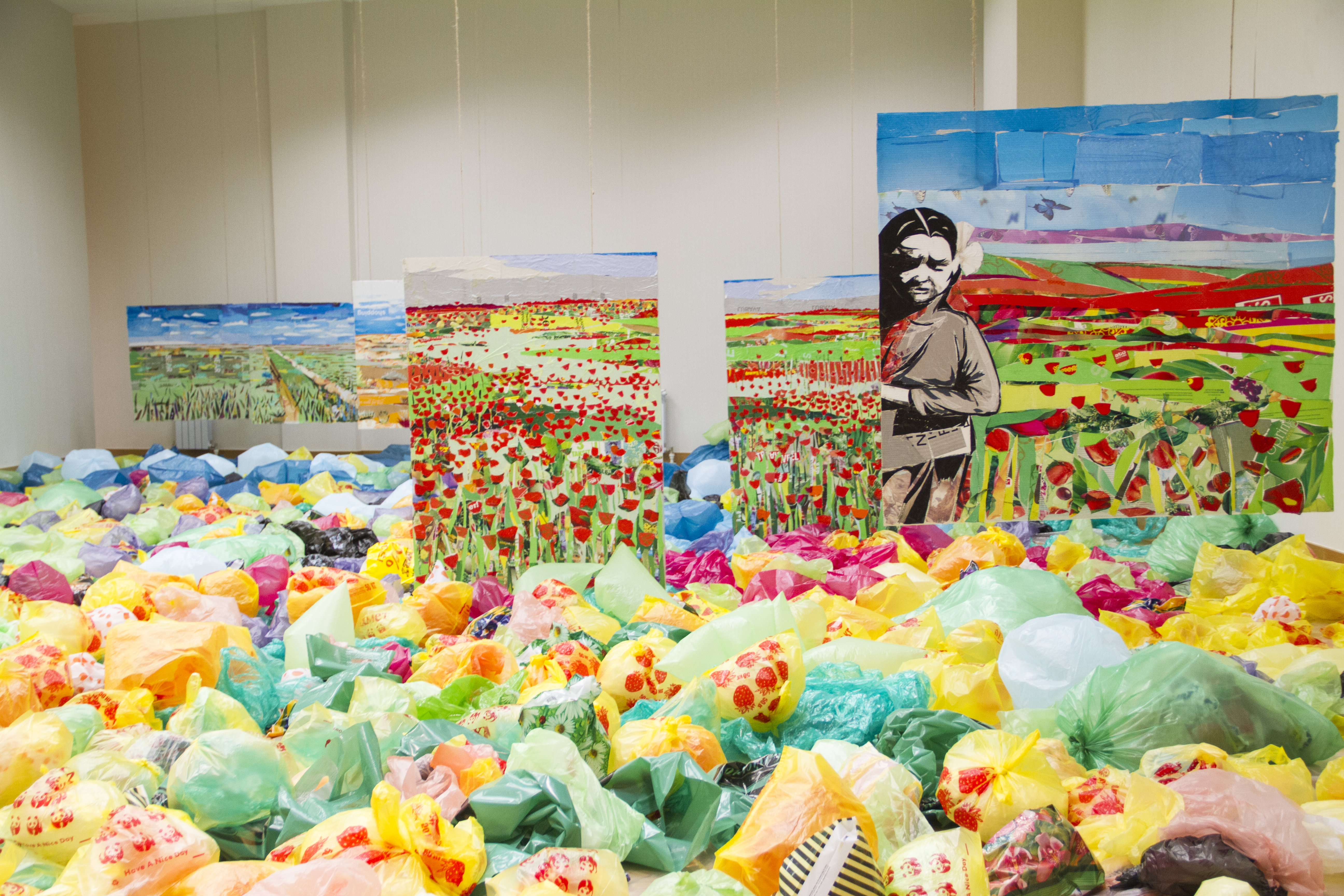 The project includes series of artworks made of plastic bags glued on polycarbonate sheets. The artworks are made with no paints or other traditional materials such as canvas, brush, bronze or anything institutional. Exclusively with plastic bags – some of them are branded with titles from the boutiques, shops, supermarkets, some just garbage bags. All the material was collected by public with assistance of AlaDalaArt (art of colorful steppe) – action that was started in 2016.