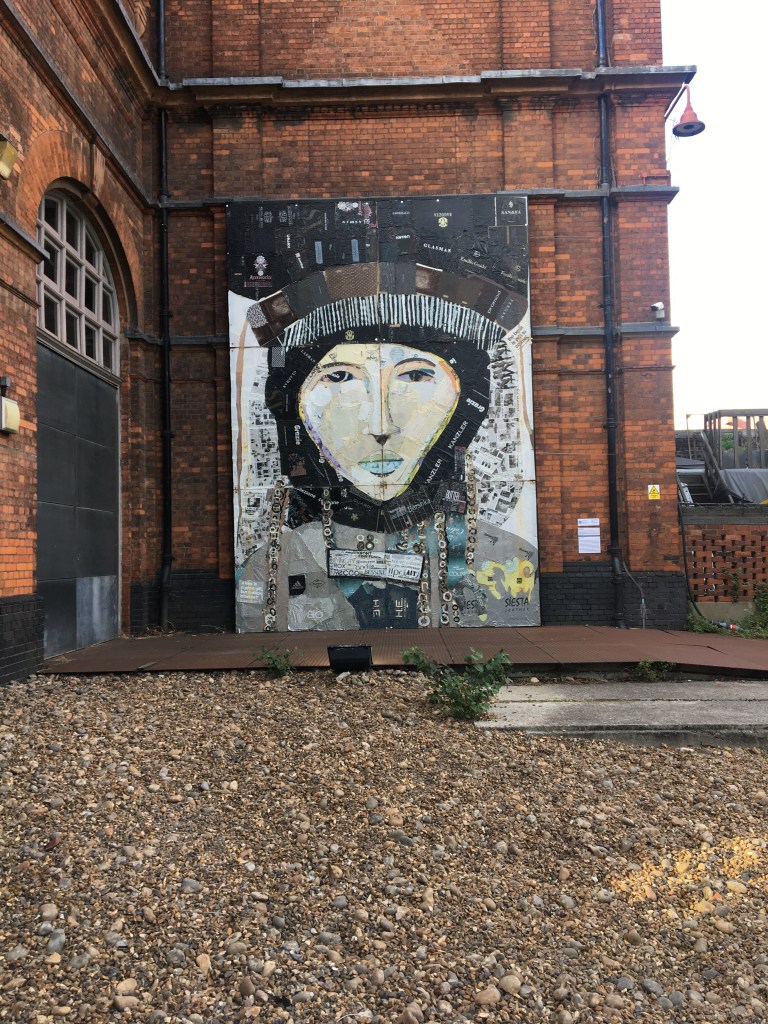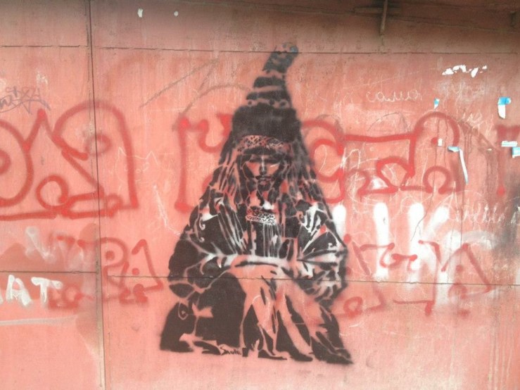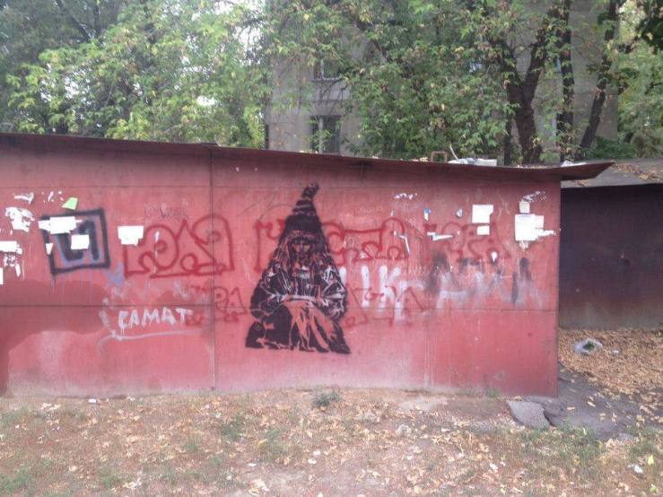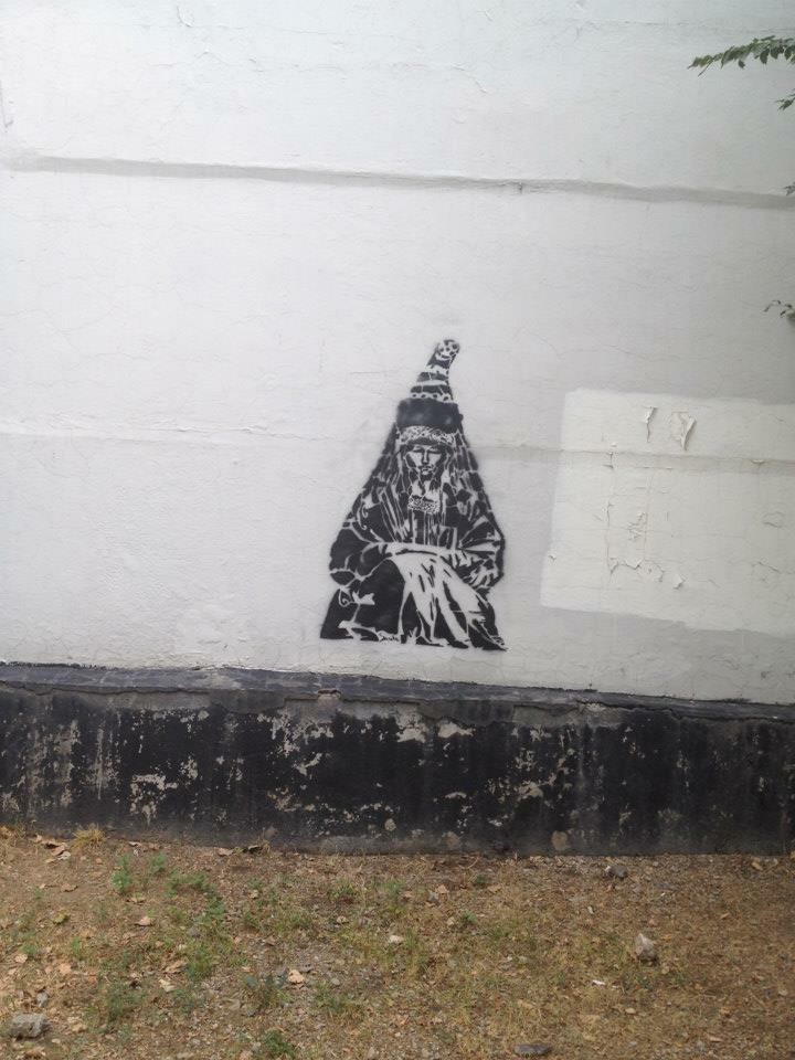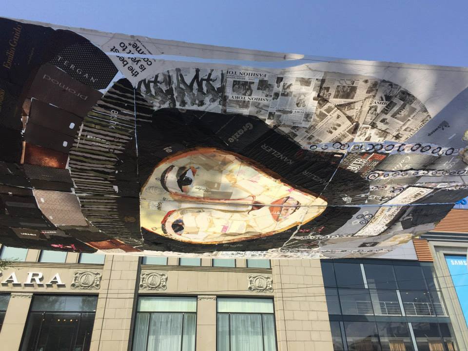 When the work KELIN was finished, it was hanged over the pedestrian street in Almaty. Under the work I placed some urban furniture with artificial grass so the viewer can lay on it and observe the artwork from the below. The sun was going through the eyes of the Bride and generally adding up to the overall color palette of the artwork. The artwork stands for my continuous research of time, history and its place in the the contemporary practices. The artwork takes further step from my paintings as it deals directly with public in the site-specific environment. The piece is based on the past while its deconstruction happens now and here in the complex context of the identity search that involved not only the creative minds but simply the people that are also inseparable part of this process.