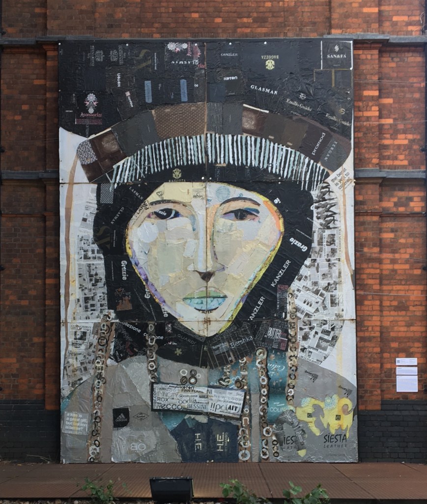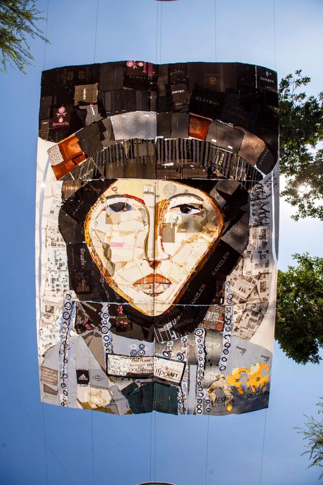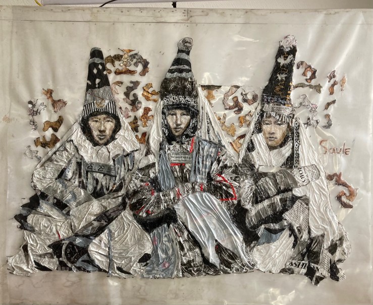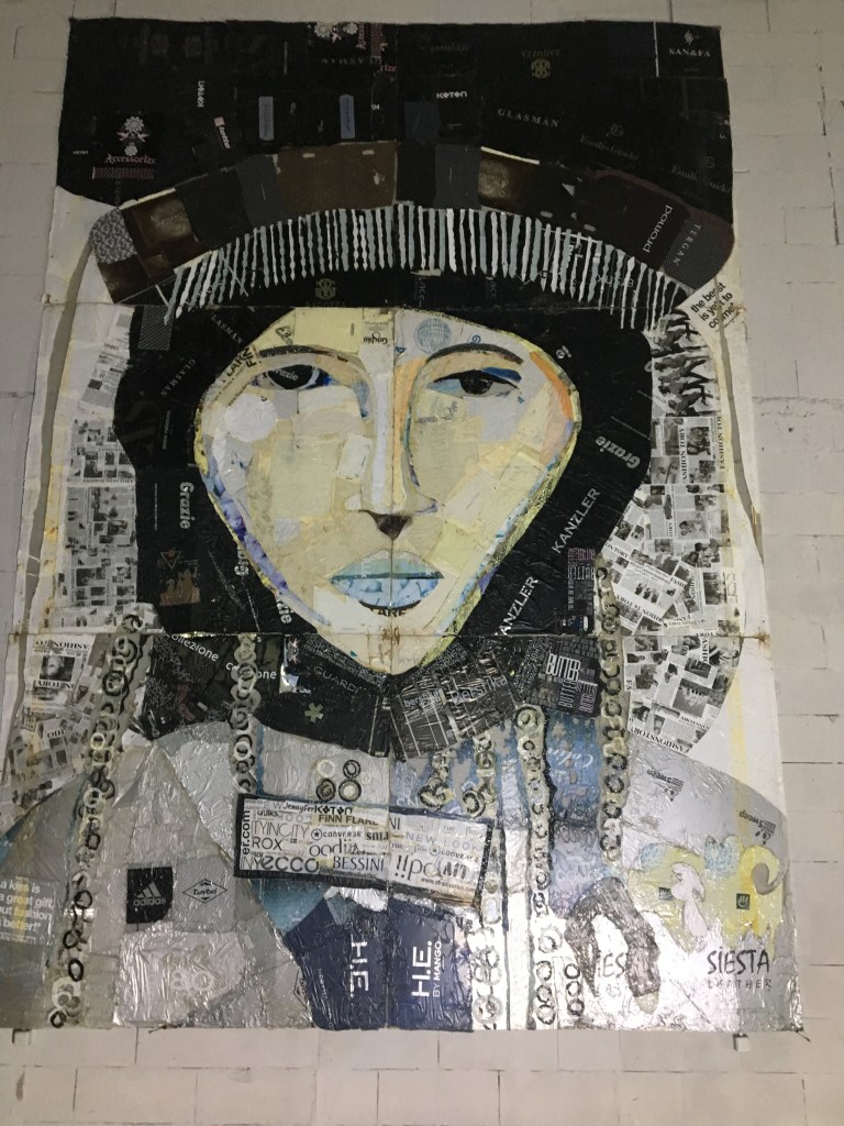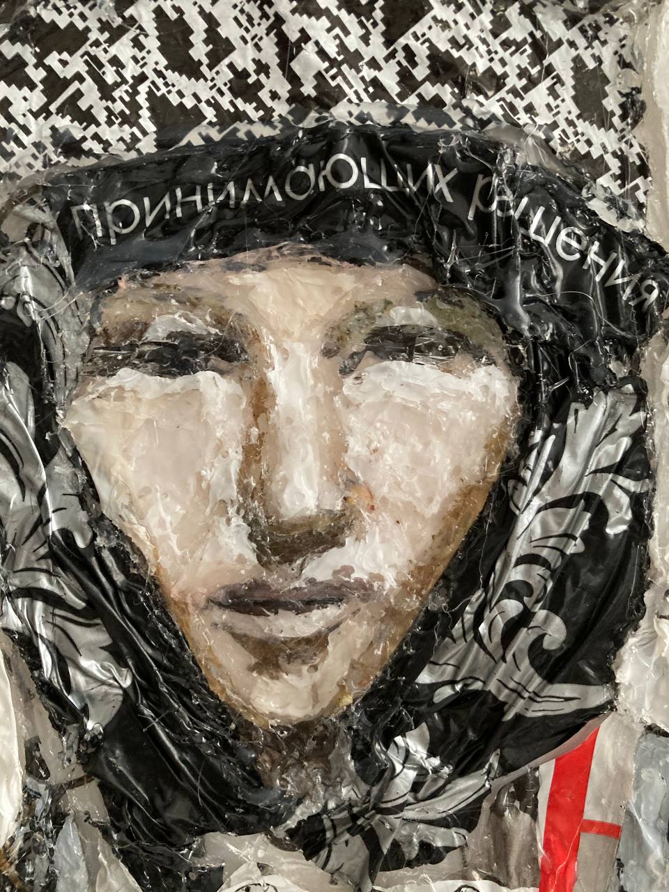 My idea was to make a massive archetypal image of a Kazakh bride with the sag of recycled materials brought by general public. The image of the bride itself is based on the archival photo that I have used for another artwork in prior to the monumental public art piece for ARTBAT. The artwork is Three Bride, 2015. Plastic bags on board. 100×140 cm
